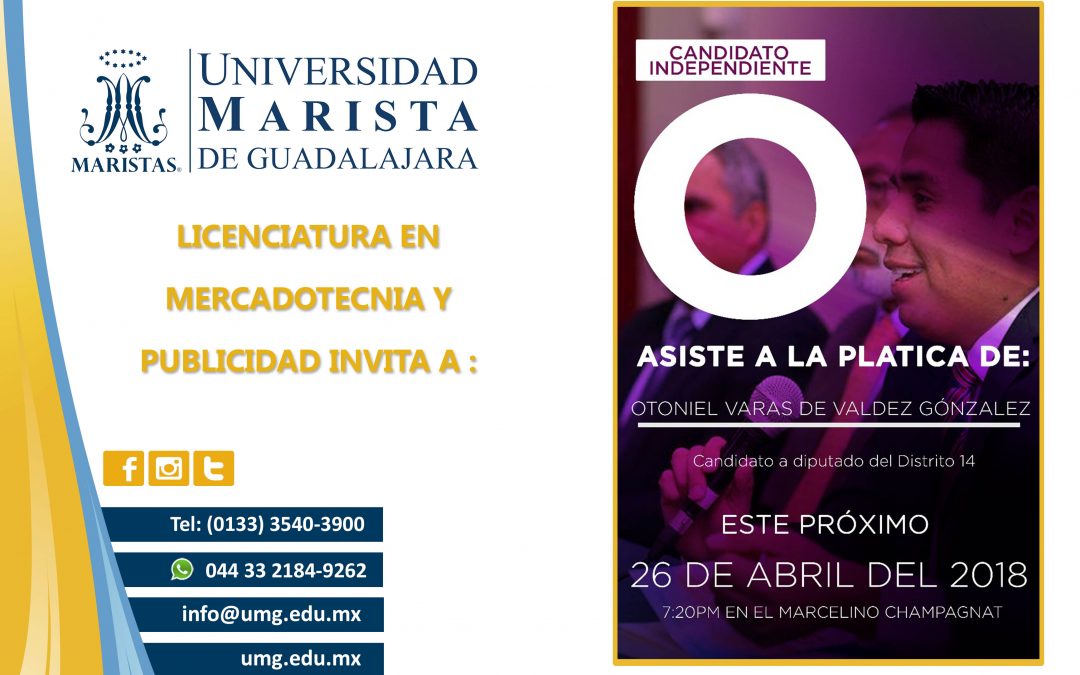 Licenciatura en Mercadotecnia y Publicidad 8° semestre invita a: Platica con el candidato a diputado del distrito 14 Otoniel Varas De Valdez González. 26 de abril, 19:20 horas. Auditorio Marcelino Champagnat. Universidad Marista de Guadalajara...