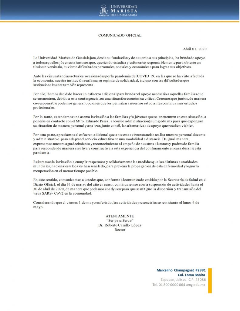 COMUNICADO OFICIAL 1/ABRIL/2020