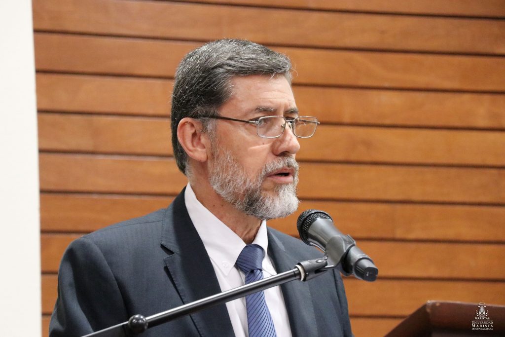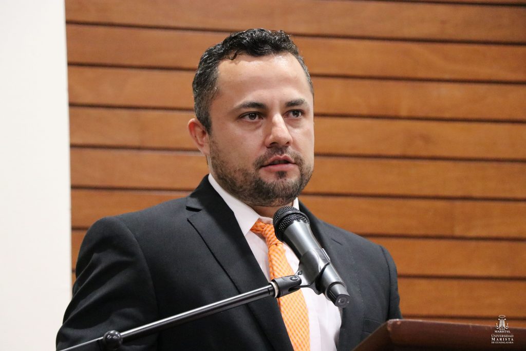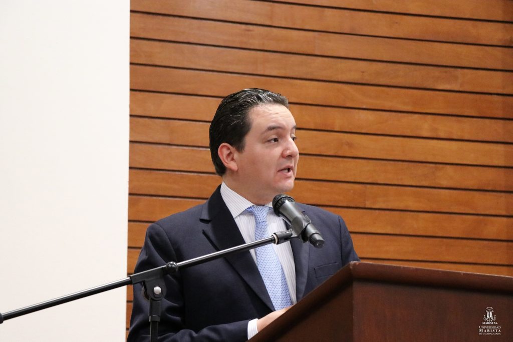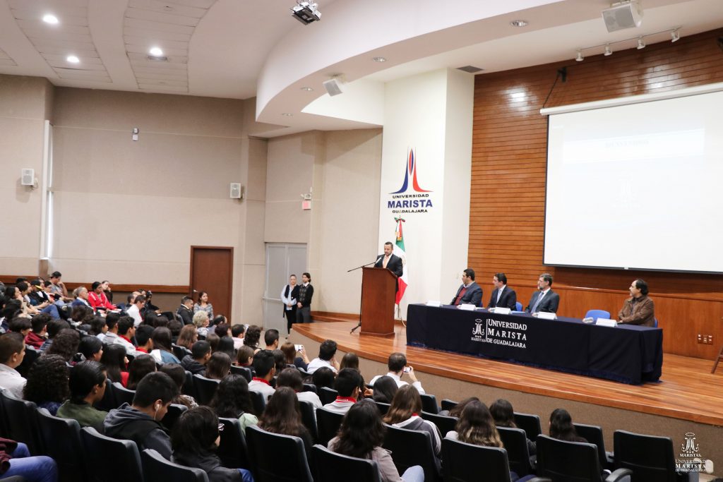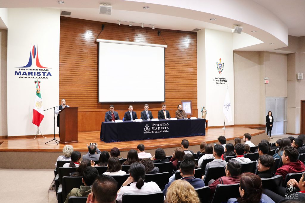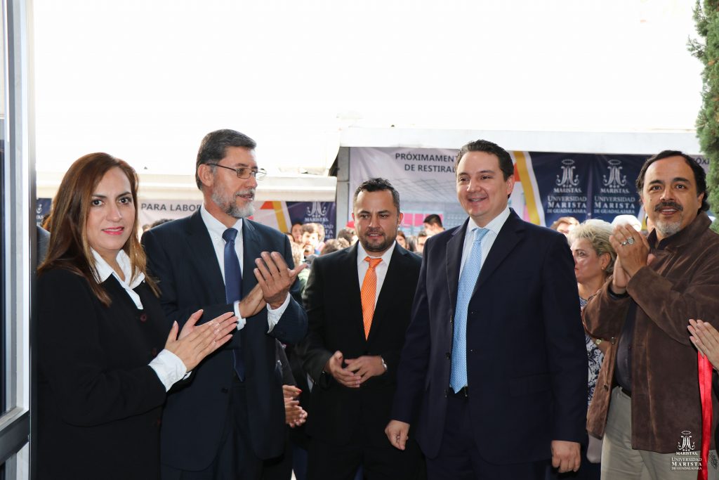 Mtro. Alejandro Luthe Ríos Sub Secretario de Educación Superior de la Secretaría de Educación, Dr. Manuel Fernando Guzmán Muñoz Director de Alfabetización Digital de la Secretaría de Educación, Ing. Luis Carlos Aguirre Mora CEO de la empresa ANT. COM.MX, Dr. Roberto Carrillo López Rector de la Universidad Marista de Guadalajara, Mtro. Adolfo Ruiz Aceves Jefe de Extensión y Vinculación Universitaria.