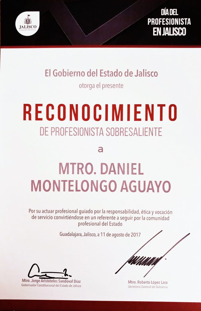 Este reconocimiento fue entregado por el Gobierno del Estado de Jalisco a través de la secretaría general de profesiones en el marco del día del profesionista.